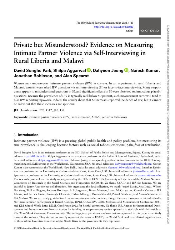私人但被误解了?利比里亚和马拉维农村通过自我访谈衡量亲密伴侣暴力的证据(英文版)
