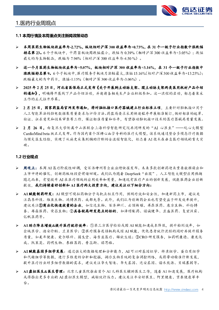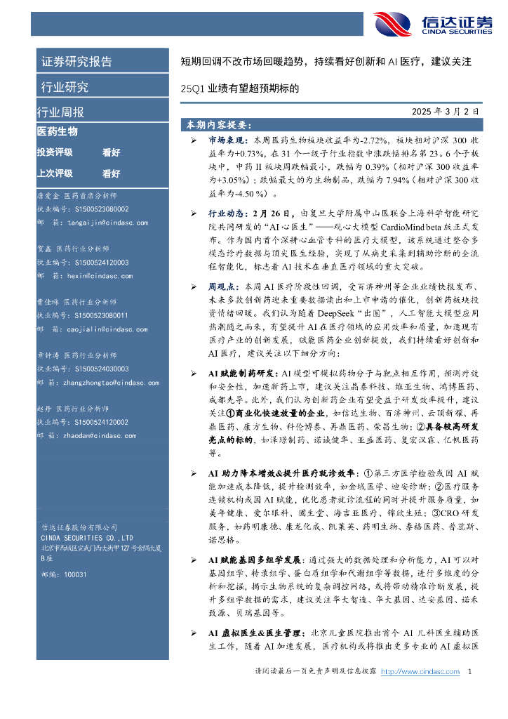 信达证券:医药生物行业周报:短期回调不改市场回暖趋势,持续看好创新和AI医疗,建议关注25Q1业绩有望超预期标的.pdf