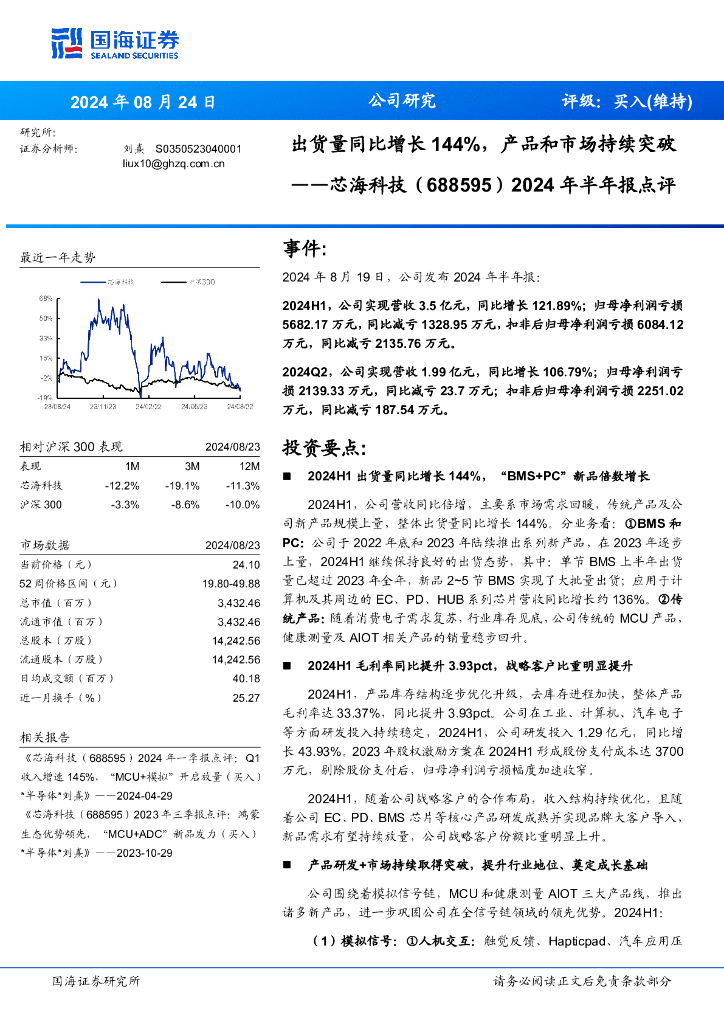 国海证券:芯海科技(688595)-2024年半年报点评:出货量同比增长144%,产品和市场持续突破.pdf