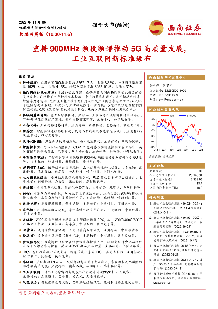 西南证券:物联网周报:重耕900MHz频段频谱推动5G高质量发展,工业互联网新标准颁布.pdf