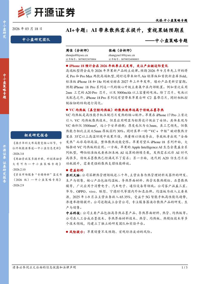 开源证券:中小盘策略专题:AI+专题:AI带来散热需求提升,重视果链预期差-260318.pdf