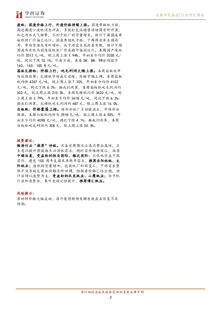 华西证券:造纸行业数据跟踪报告:文化纸涨价函不断落地,包装纸业绩迎来复苏.pdf