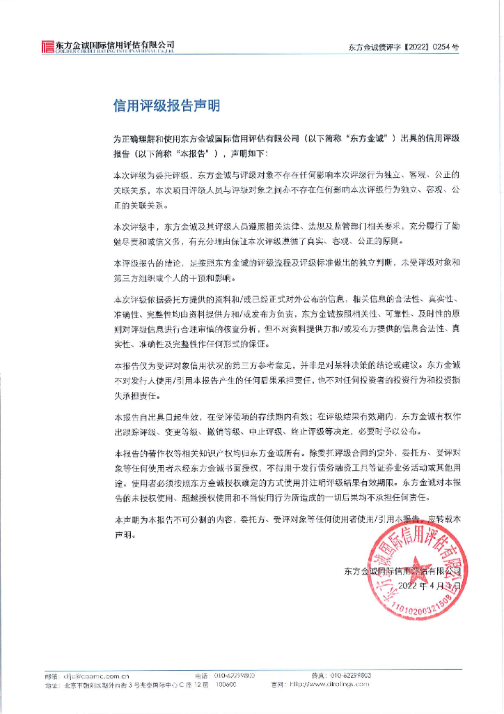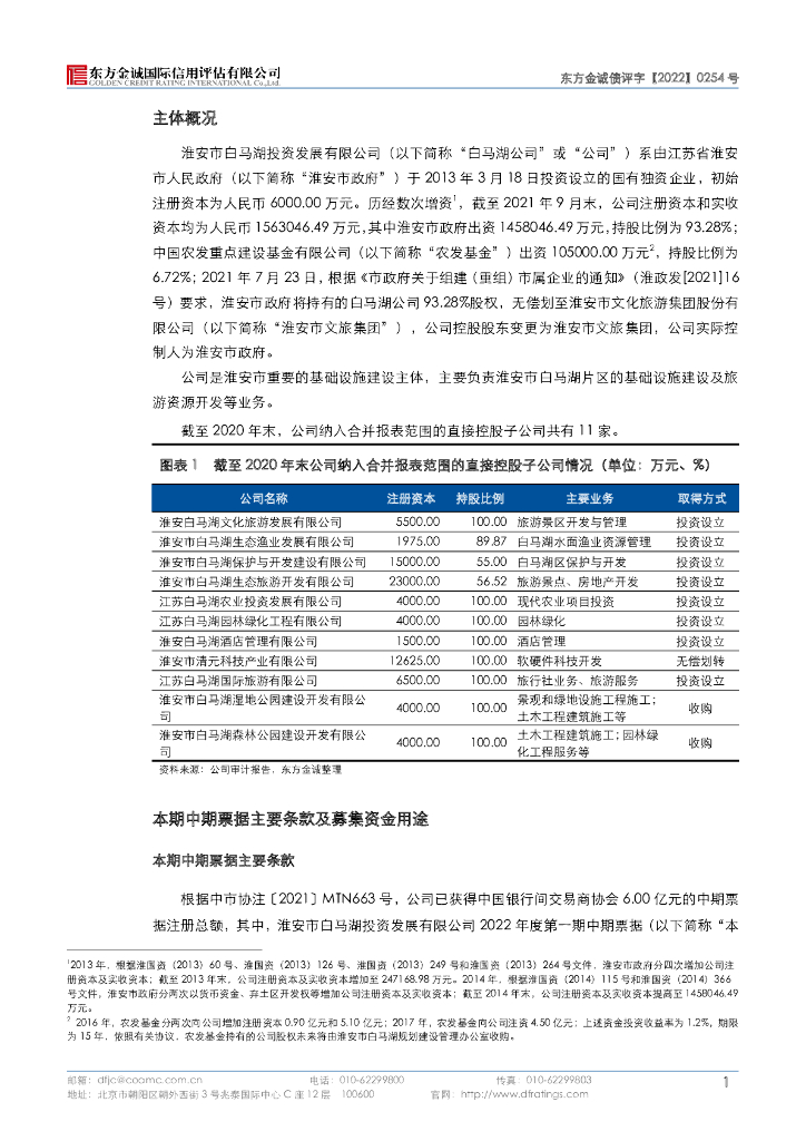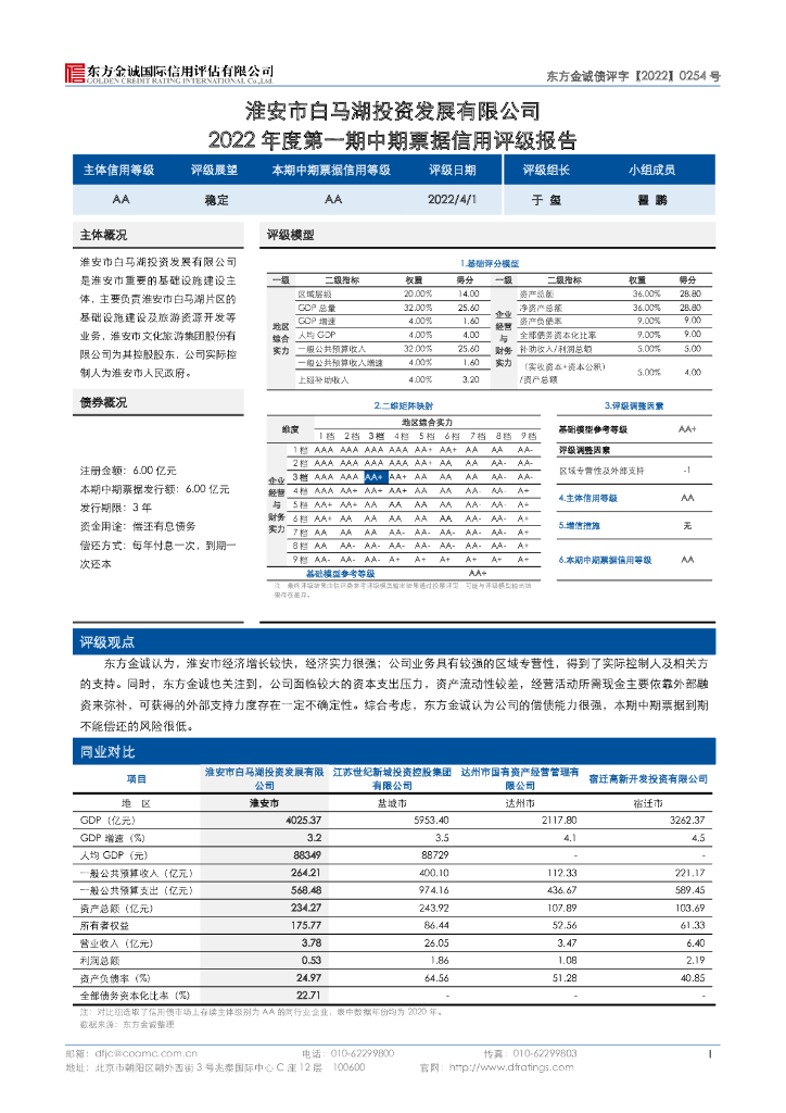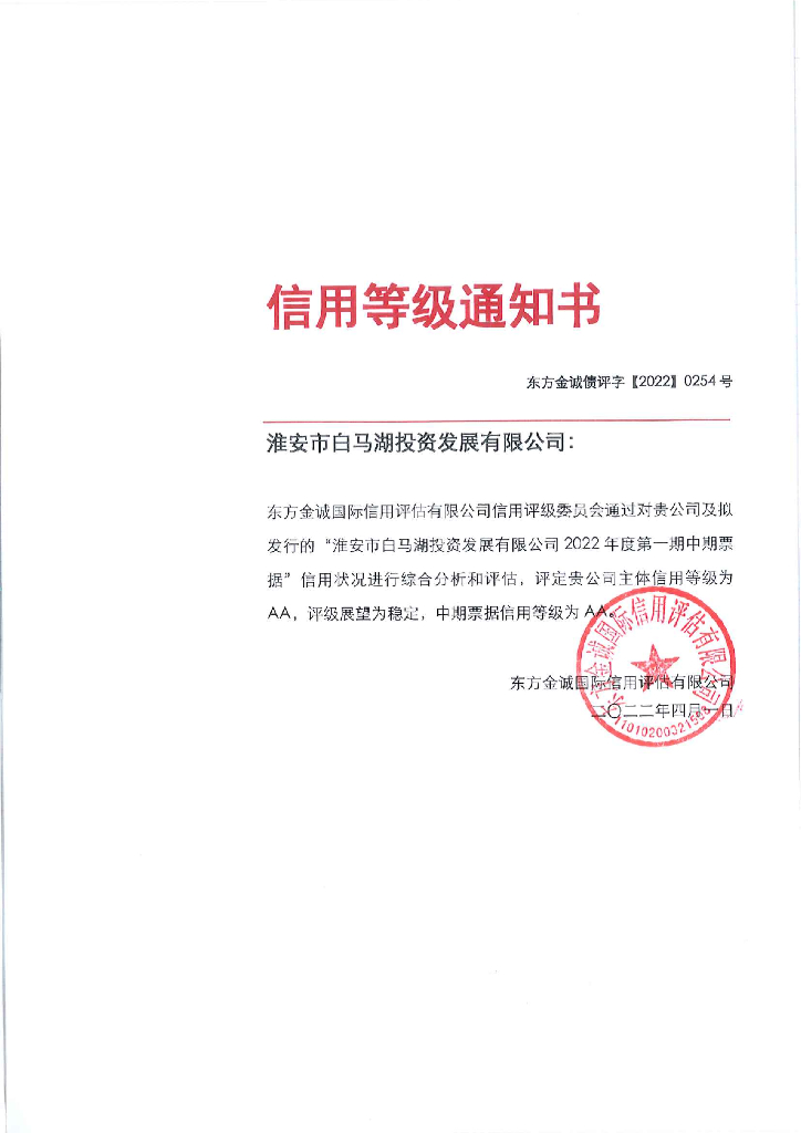 东方金诚:淮安市白马湖投资发展有限公司2022年度第一期中期票据信用评级报告及跟踪评级安排.pdf