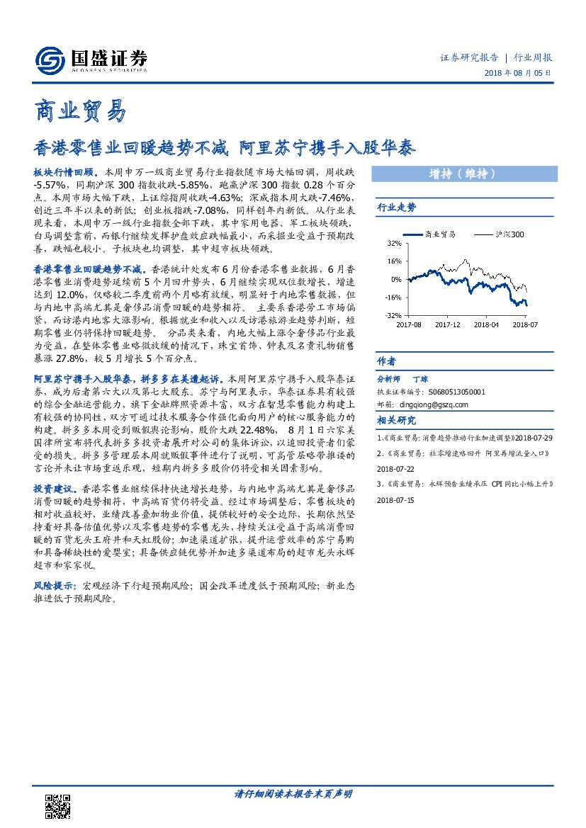 国盛证券:商业贸易行业周报:香港零售业回暖趋势不减 阿里苏宁携手入股华泰.pdf