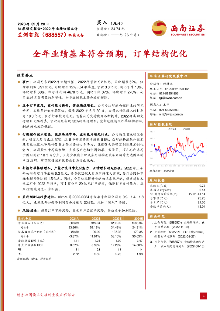 西南证券:兰剑智能(688557)-全年业绩基本符合预期,订单结构优化.pdf