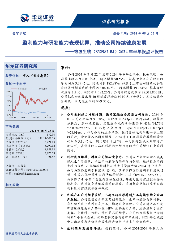 华龙证券:锦波生物(832982)-2024年半年报点评报告:盈利能力与研发能力表现优异,推动公司持续健康发展.pdf