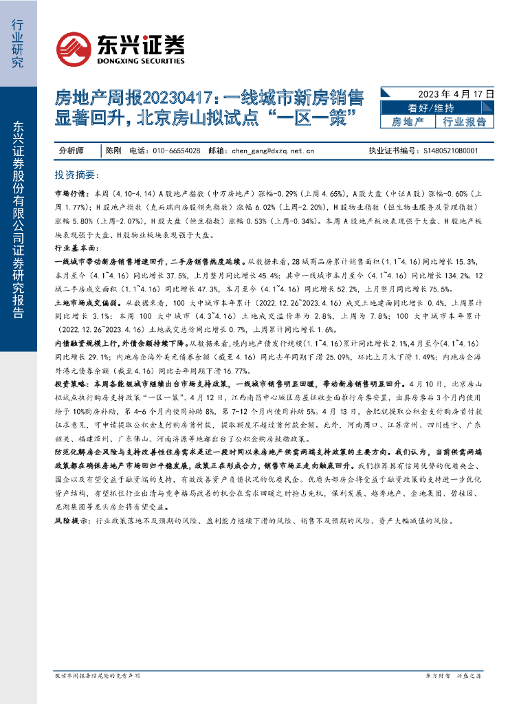 东兴证券:房地产行业周报:一线城市新房销售显著回升,北京房山拟试点“一区一策”.pdf