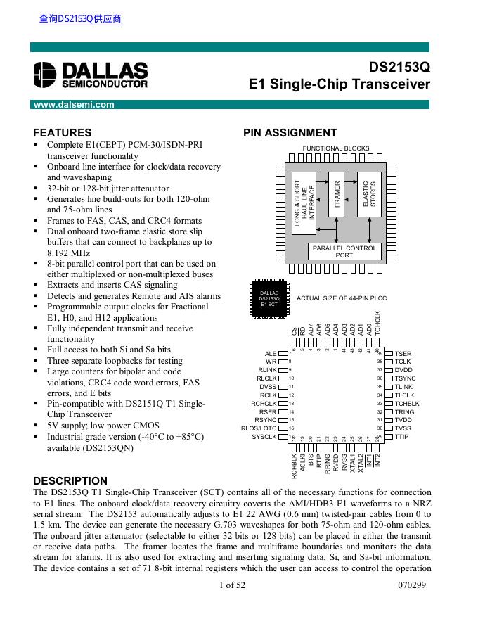 DALLAS DS2153Q E1 Single-Chip Transceiver 数据手册.pdf