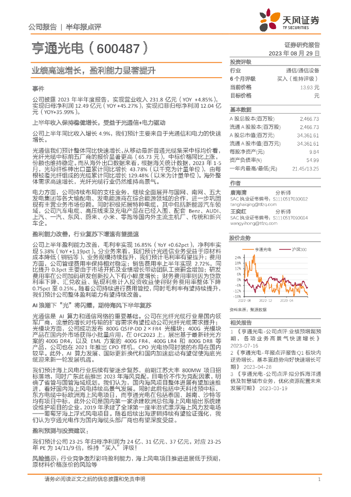 天风证券:亨通光电(600487)-业绩高速增长,盈利能力显著提升.pdf