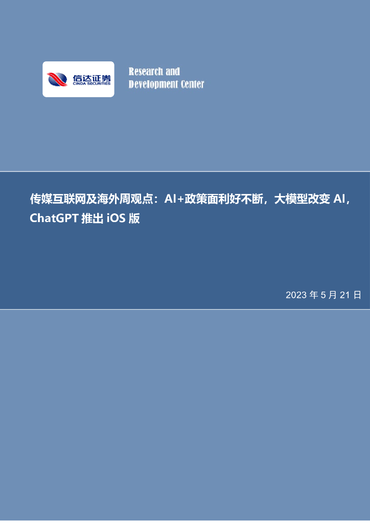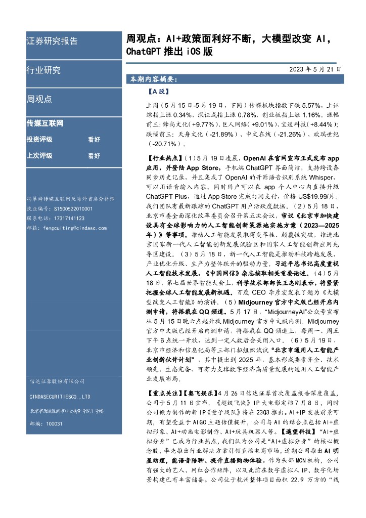信达证券:传媒互联网周观点:AI+政策面利好不断,大模型改变AI,ChatGPT推出iOS版.pdf
