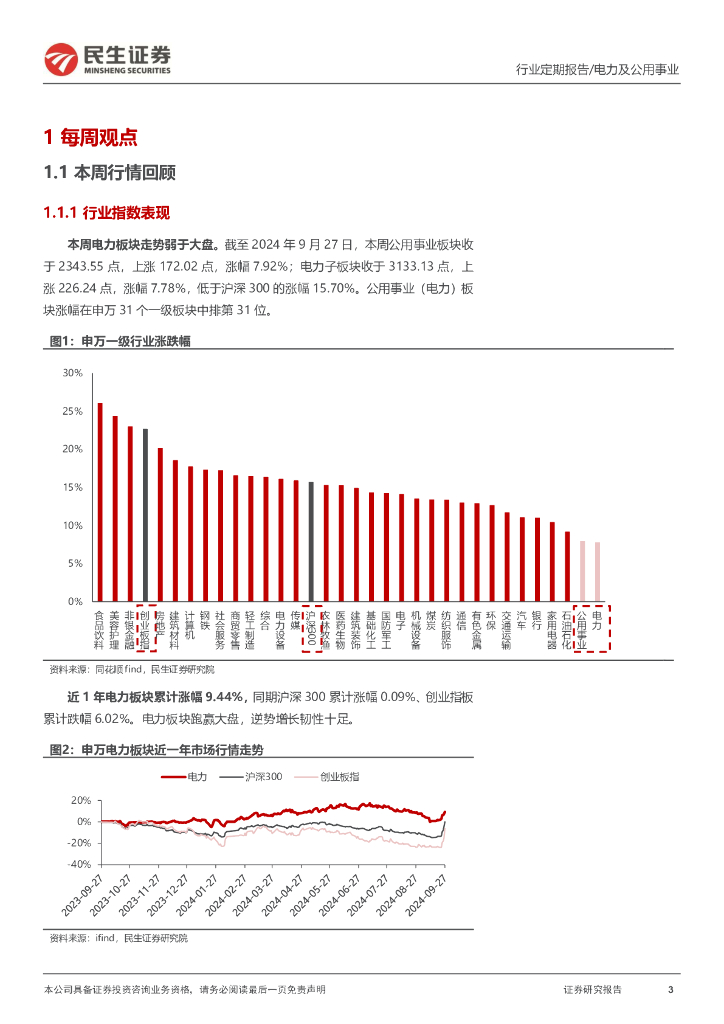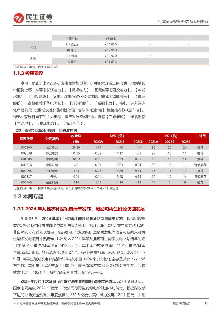 民生证券:电力及公用事业行业周报(24WK39):第9批绿电补贴清单发布,1-8月风光装机增长.pdf
