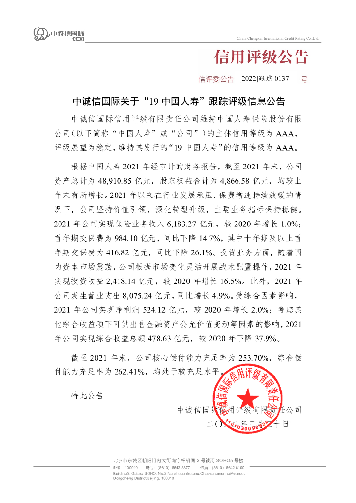 中诚信:中诚信国际关于“19中国人寿”跟踪评级信息公告.pdf