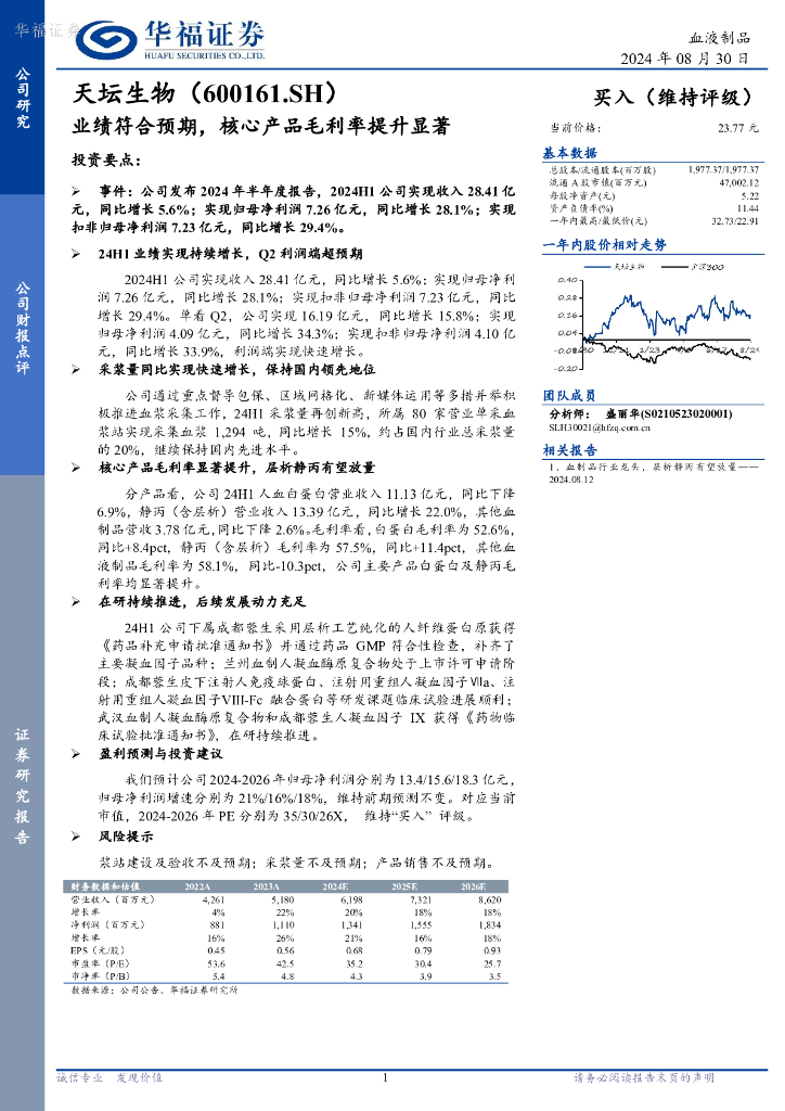 华福证券:天坛生物(600161)-业绩符合预期,核心产品毛利率提升显著.pdf