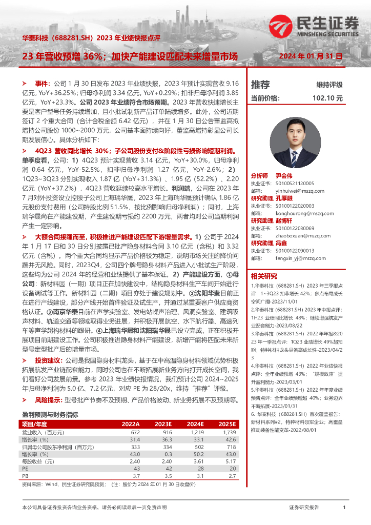 民生证券:华秦科技(688281)-2023年业绩快报点评:23年营收预增36%;加快产能建设匹配未来增量市场.pdf