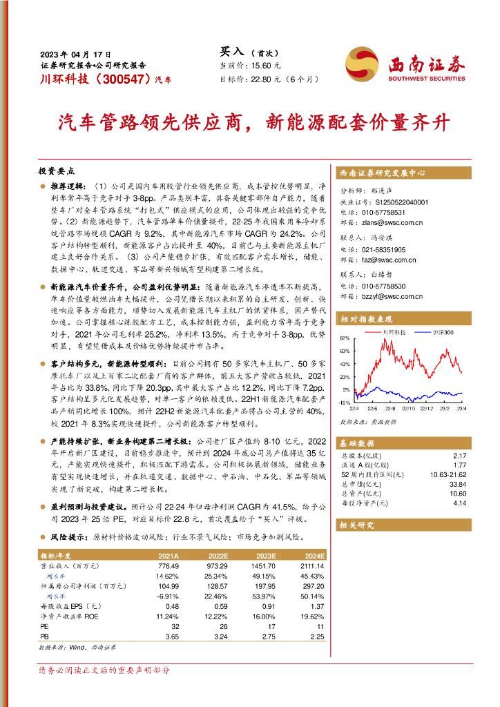 西南证券:川环科技(300547)-汽车管路领先供应商,新能源配套价量齐升.pdf