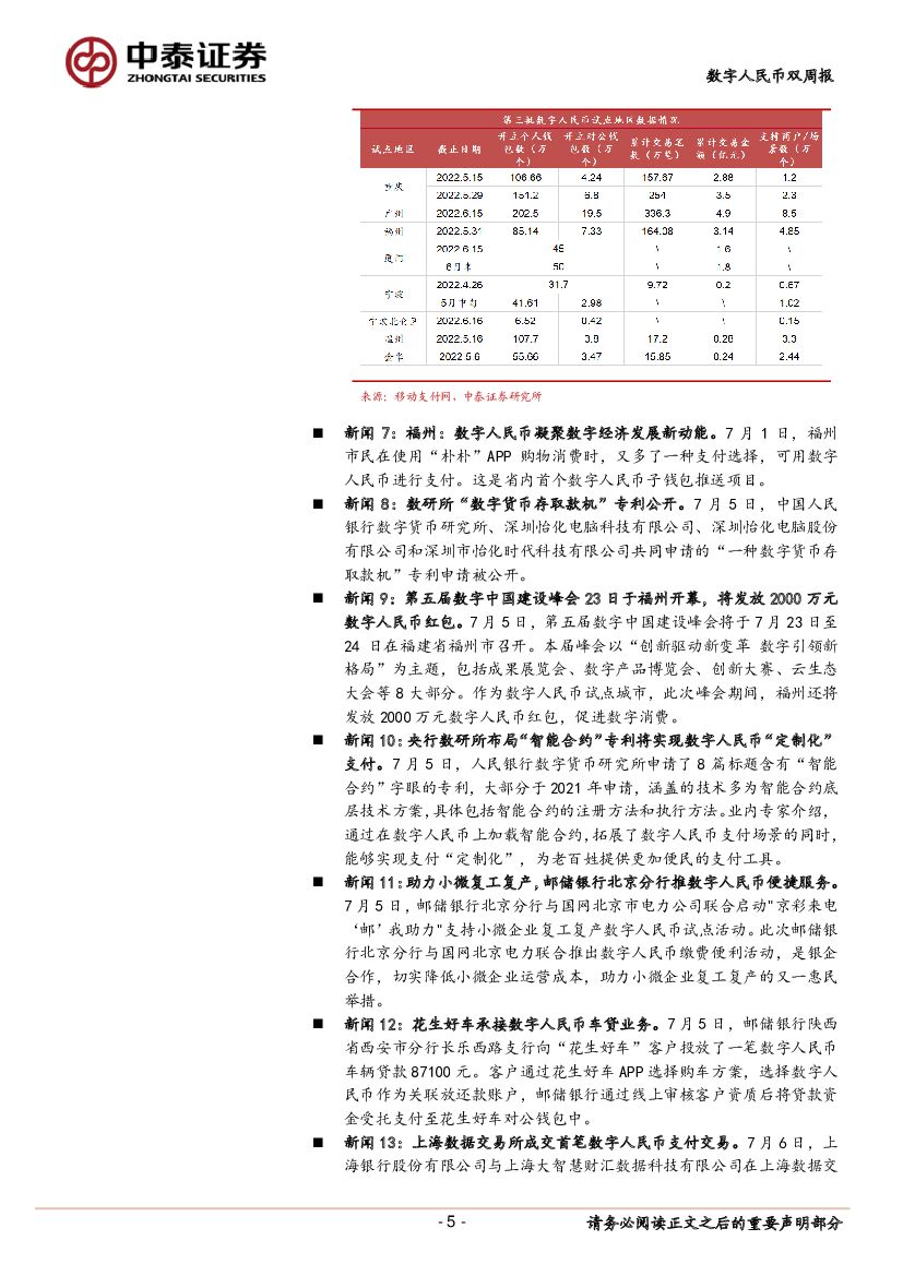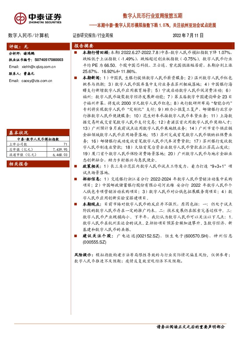 中泰证券:数字人民币行业双周报第五期:本期中泰-数字人民币模拟指数下跌1.07%,关注杭州亚运会试点进展.pdf