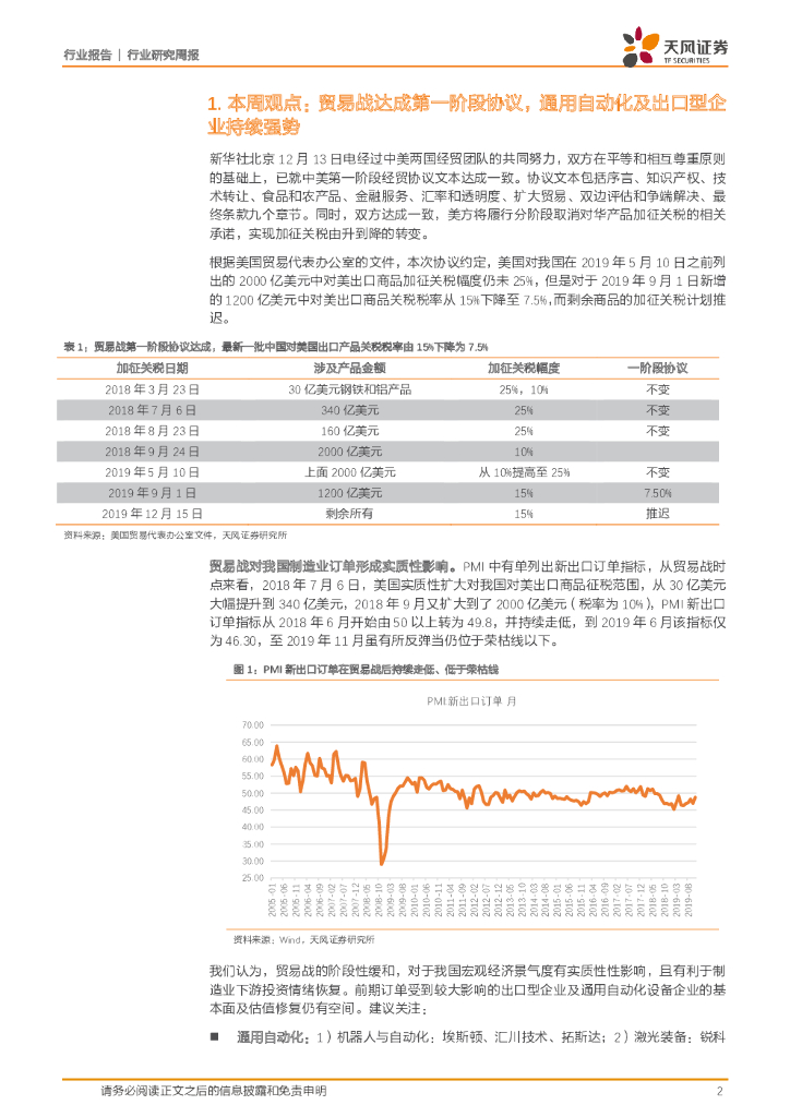天风证券:【天风机械周报W51】:贸易战达成第一阶段协议,通用自动化及出口型装备持续强势.pdf