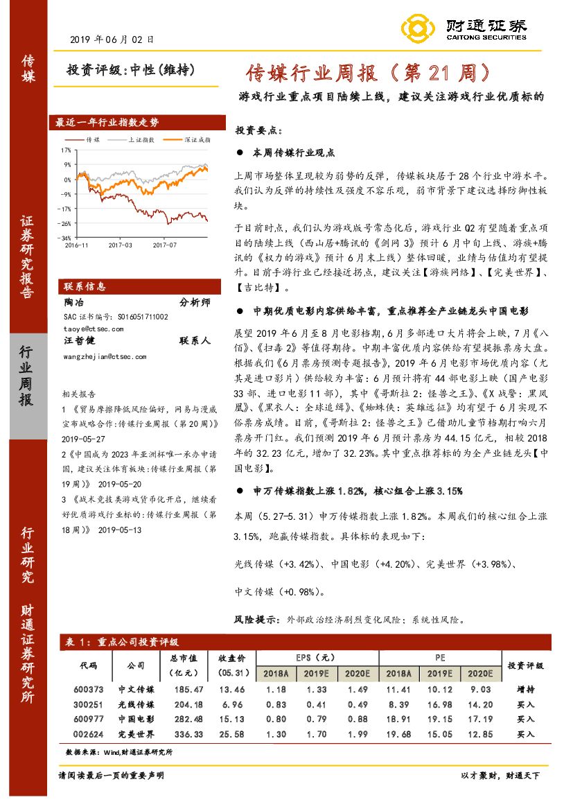 财通证券:传媒行业周报(第21周):游戏行业重点项目陆续上线,建议关注游戏行业优质标的.pdf
