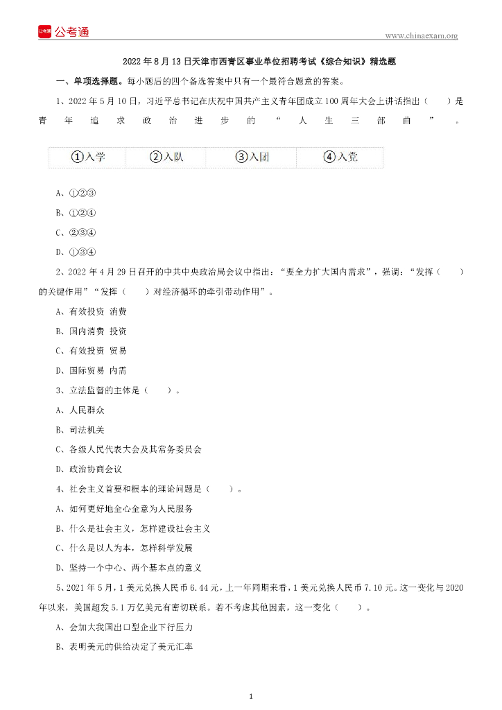 2022年8月13日天津市西青区事业单位招聘考试《综合知识》精选题.pdf