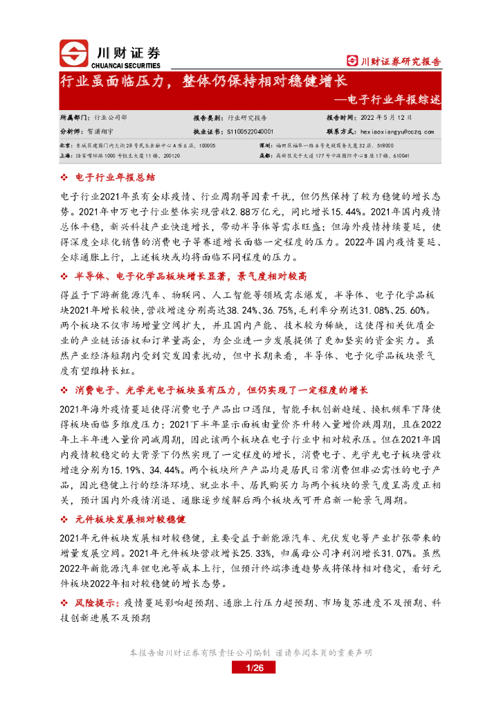 川财证券:电子行业年报综述:行业虽面临压力,整体仍保持相对稳健增长.pdf