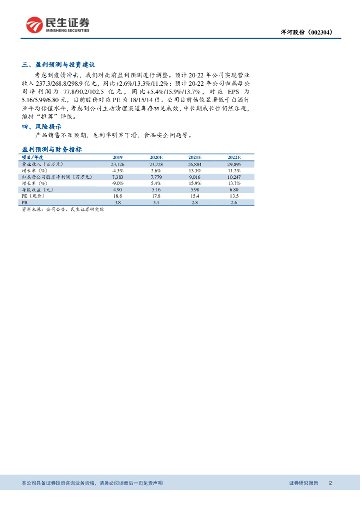 民生证券:洋河股份(002304)-2019年报及2020年一季报点评:主动去库存动作接近尾声,疫情后有望迎来复苏.pdf