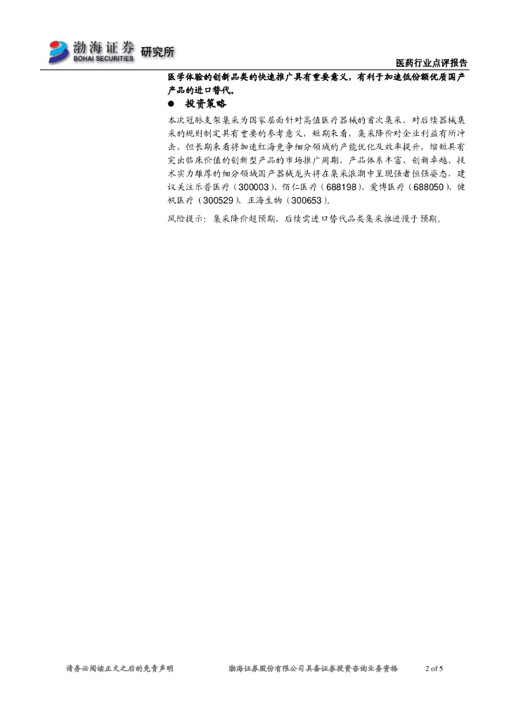 渤海证券:医药行业点评:冠脉支架集采出台,采购量划分由医疗机构决定.pdf