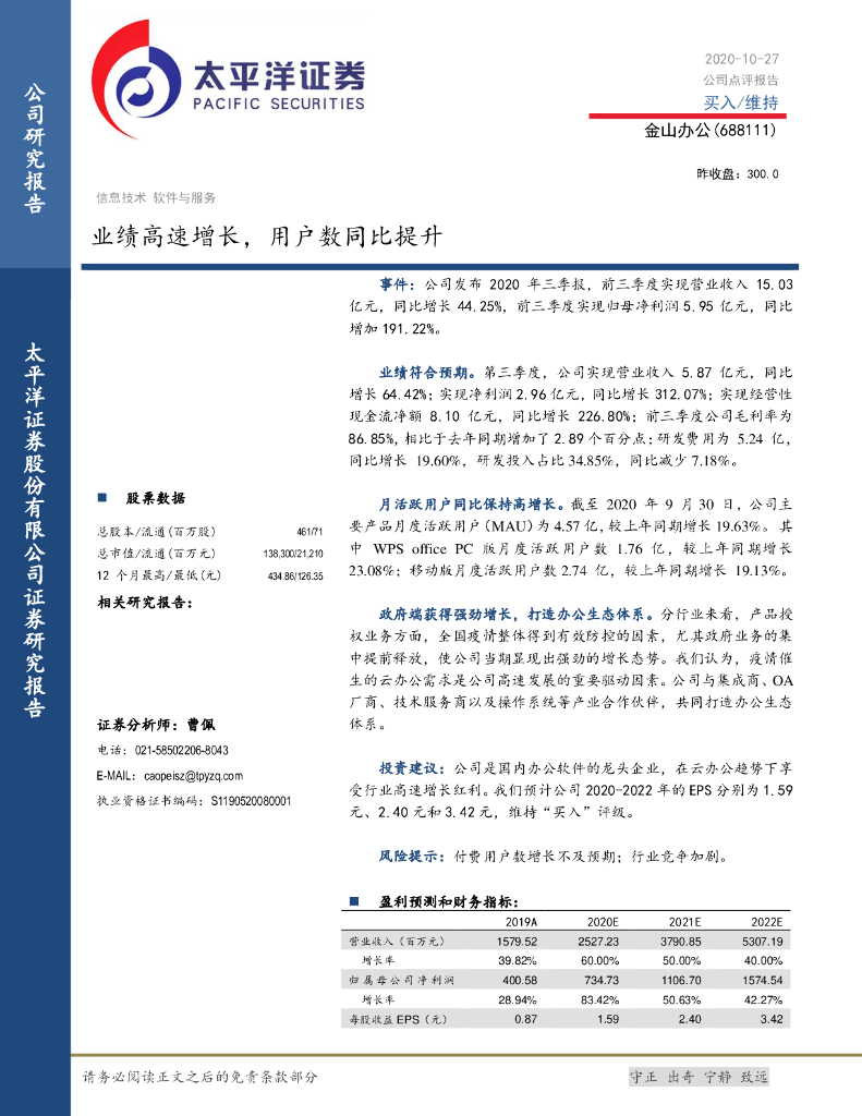 太平洋证券:金山办公(688111)-业绩高速增长,用户数同比提升.pdf
