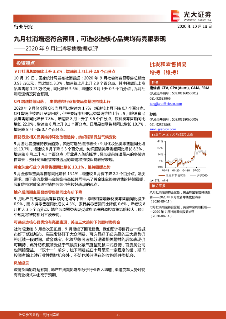 光大证券:2020年9月社消零售数据点评:九月社消增速符合预期,可选必选核心品类均有亮眼表现.pdf