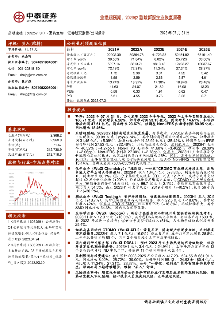 中泰证券:药明康德(603259)-业绩超预期,2023Q2剔除新冠主业恢复显著.pdf