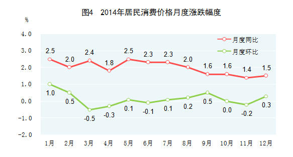 价格水平涨幅较低。全年居民消费价格比上年上涨2.0%,其中食品价格上涨3.1%。固定资产投资价格上涨0.5%。工业生产者出厂价格下降1.9%。工业生产者购进价格下降2.2%。农产品生产者价格[8]下降0.2%。