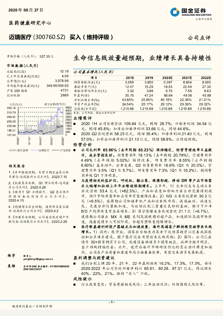 国金证券:迈瑞医疗(300760)-生命信息线放量超预期,业绩增长具备持续性.pdf