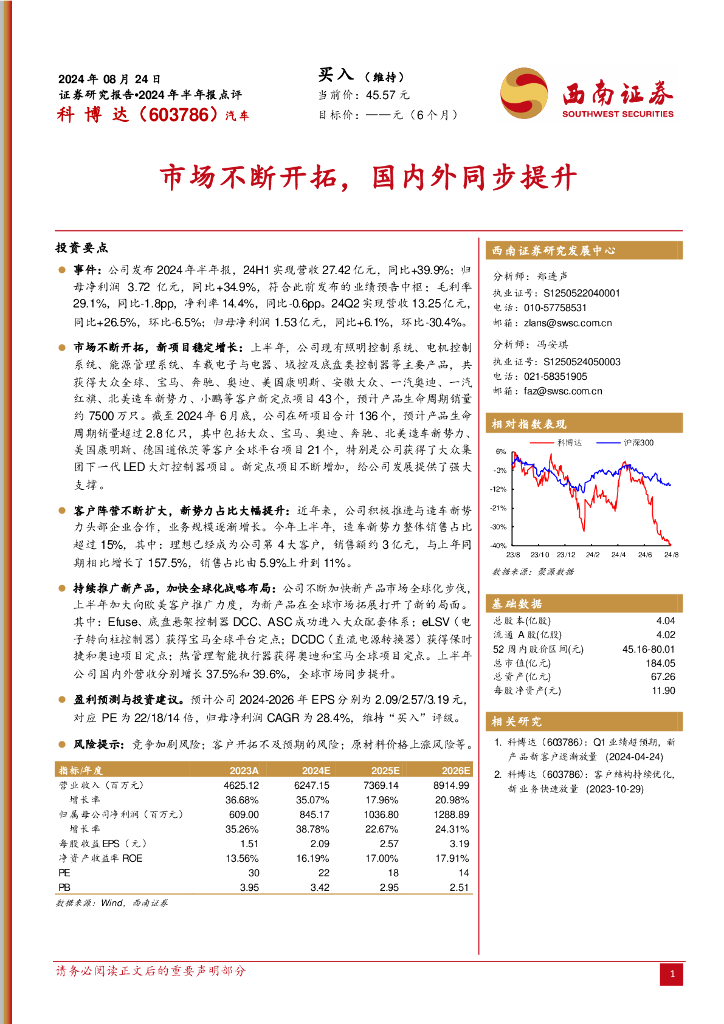 西南证券:科博达(603786)-2024年半年报点评:市场不断开拓,国内外同步提升.pdf