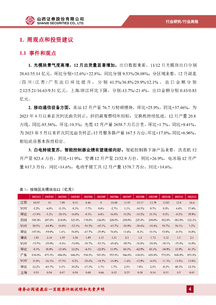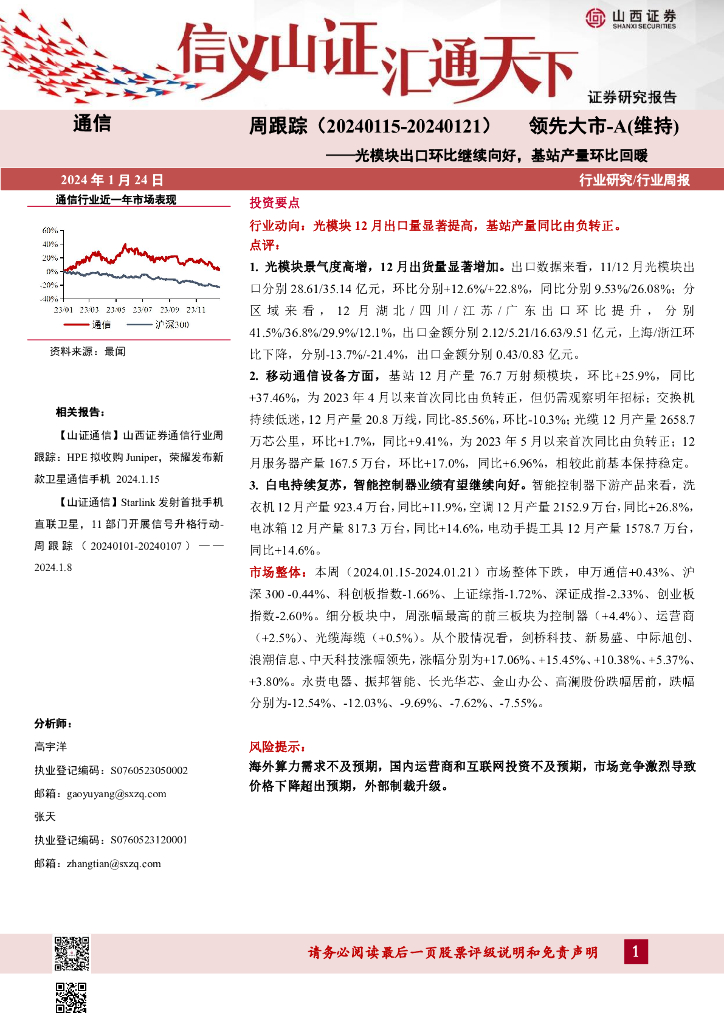 山西证券:通信周跟踪:光模块出口环比继续向好,基站产量环比回暖.pdf