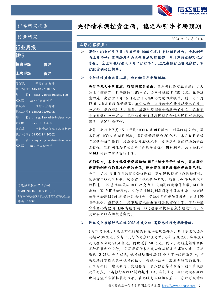 信达证券:央行精准调控资金面,稳定和引导市场预期银行.pdf