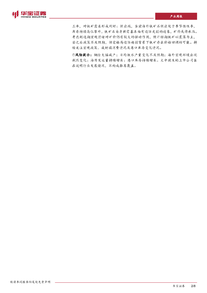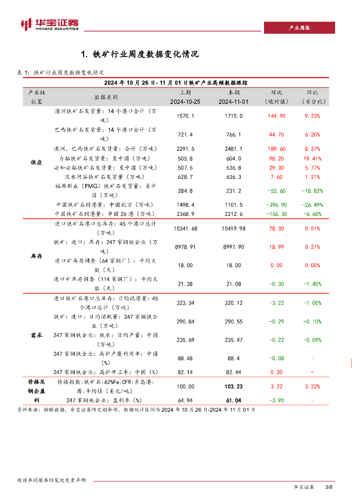 华宝证券:铁矿行业周度报告:本周铁矿需求保持较高水平,矿价环比上涨3.22%.pdf
