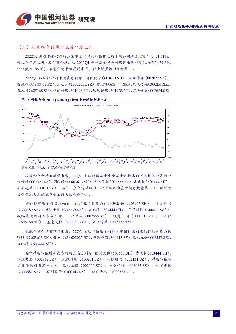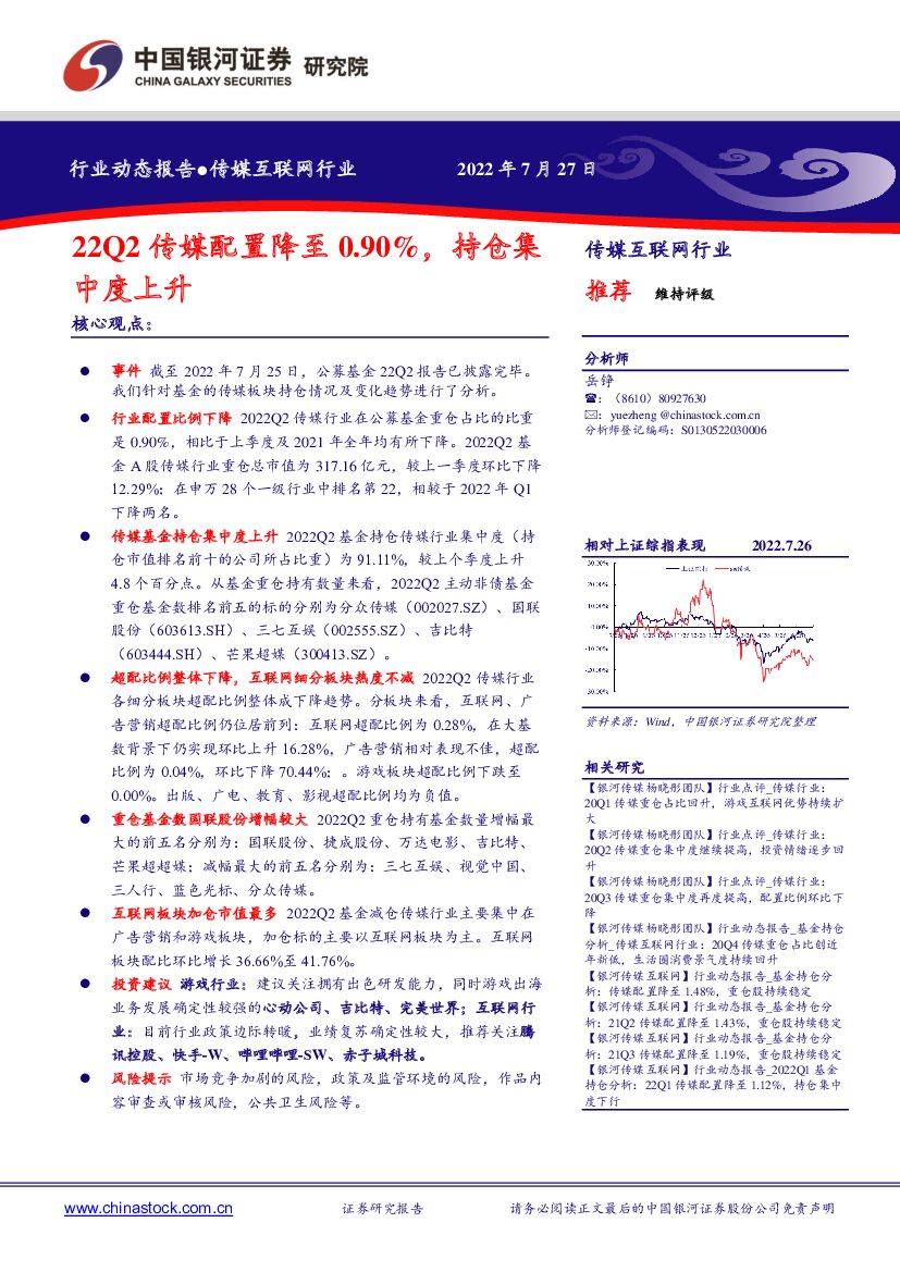 中国银河:传媒互联网行业:22Q2传媒配置降至0.90%,持仓集中度上升.pdf