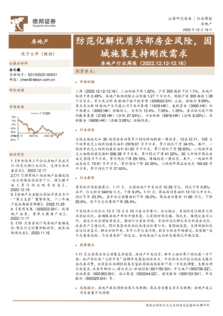 德邦证券:房地产行业周报:防范化解优质头部房企风险,因城施策支持刚改需求.pdf