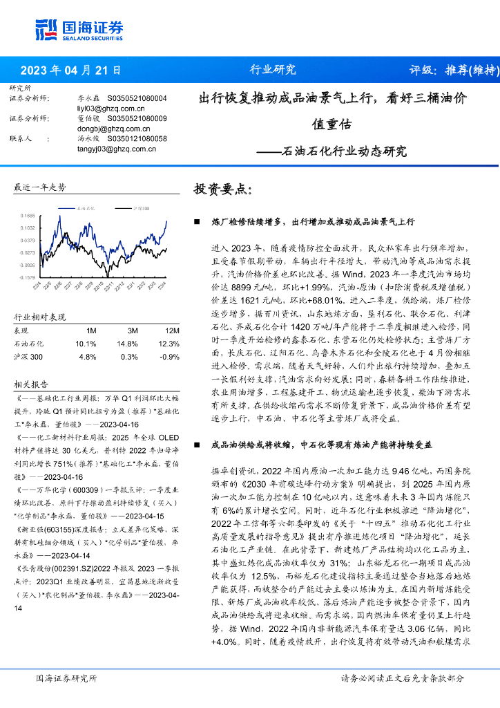 国海证券:石油石化行业动态研究:出行恢复推动成品油景气上行,看好三桶油价值重估.pdf