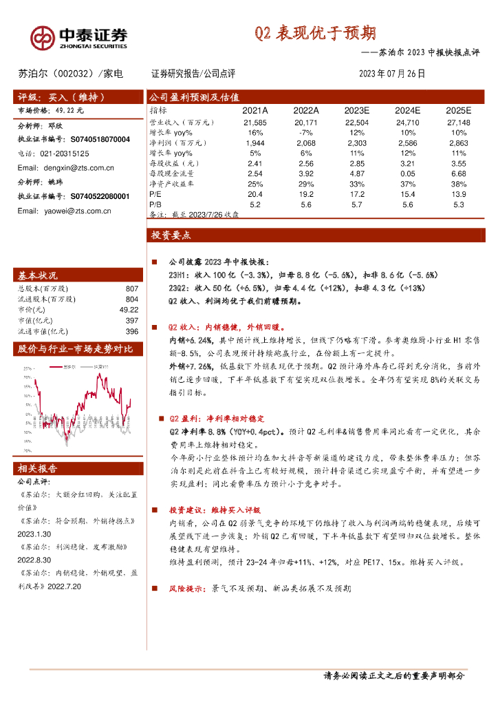 中泰证券:苏泊尔2023中报快报点评:Q2表现优于预期.pdf