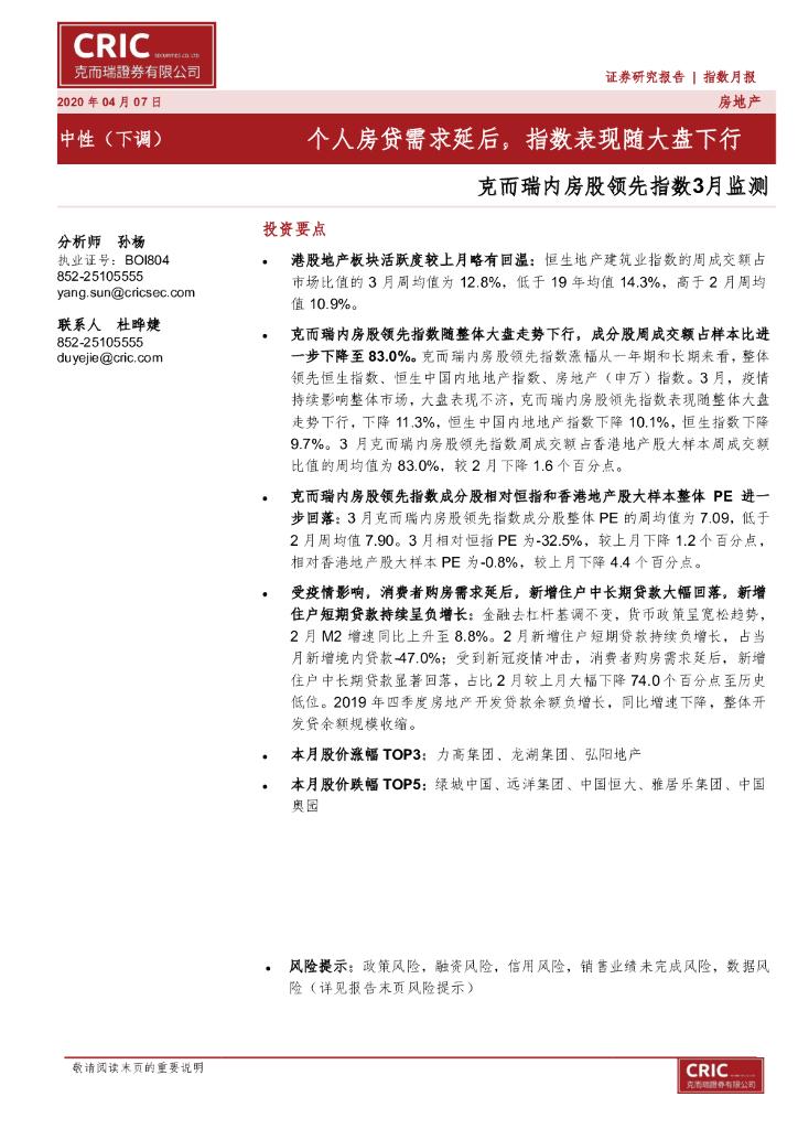 克而瑞证券:克而瑞内房股领先指数3月监测:个人房贷需求延后,指数表现随大盘下行.pdf