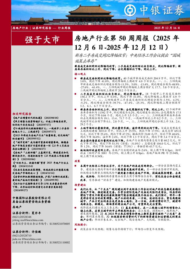 中银证券:房地产行业第50周周报:新房二手房成交同比降幅收窄;中央经济工作会议提出“因城施策去库存”.pdf
