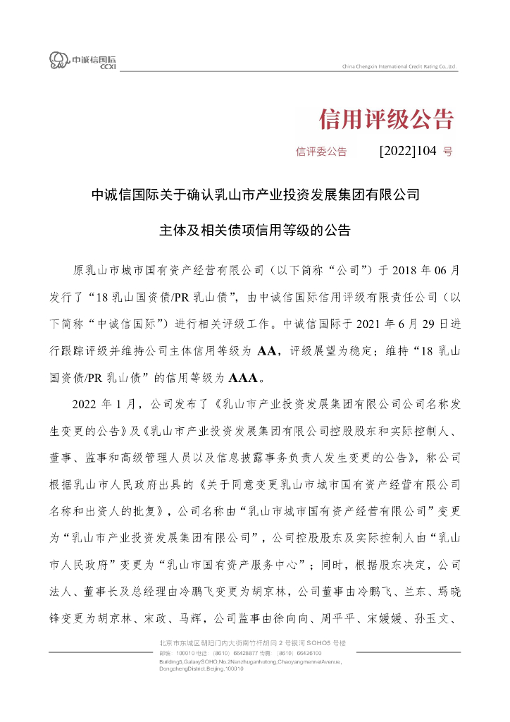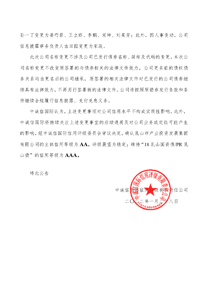 中诚信:中诚信国际关于确认乳山市产业投资发展集团有限公司主体及相关债项信用等级的公告.pdf
