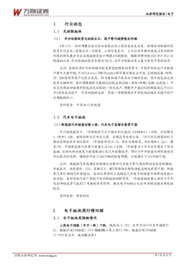 万联证券:电子行业周观点:华为加码光刻胶企业,电车销量7月高企利好下半年汽车电子业绩.pdf
