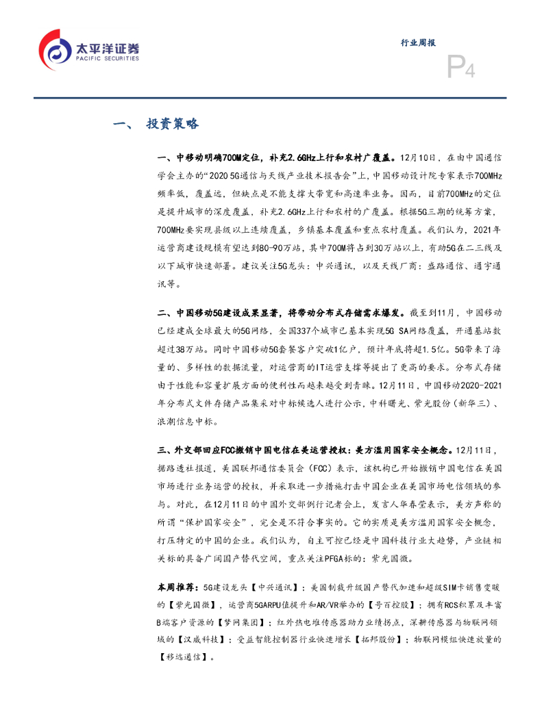 太平洋证券:通信行业周报:中移动明确700M定位,补充2.6GHz上行和农村广覆盖.pdf