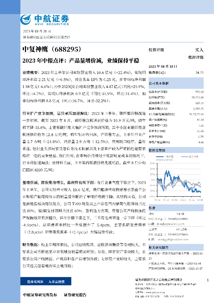 中航证券:中复神鹰(688295)-2023年中报点评:产品量增价减,业绩保持平稳.pdf