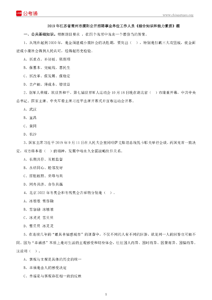 2019年江苏常州溧阳事业单位考试《综合知识和能力素质》试题.pdf