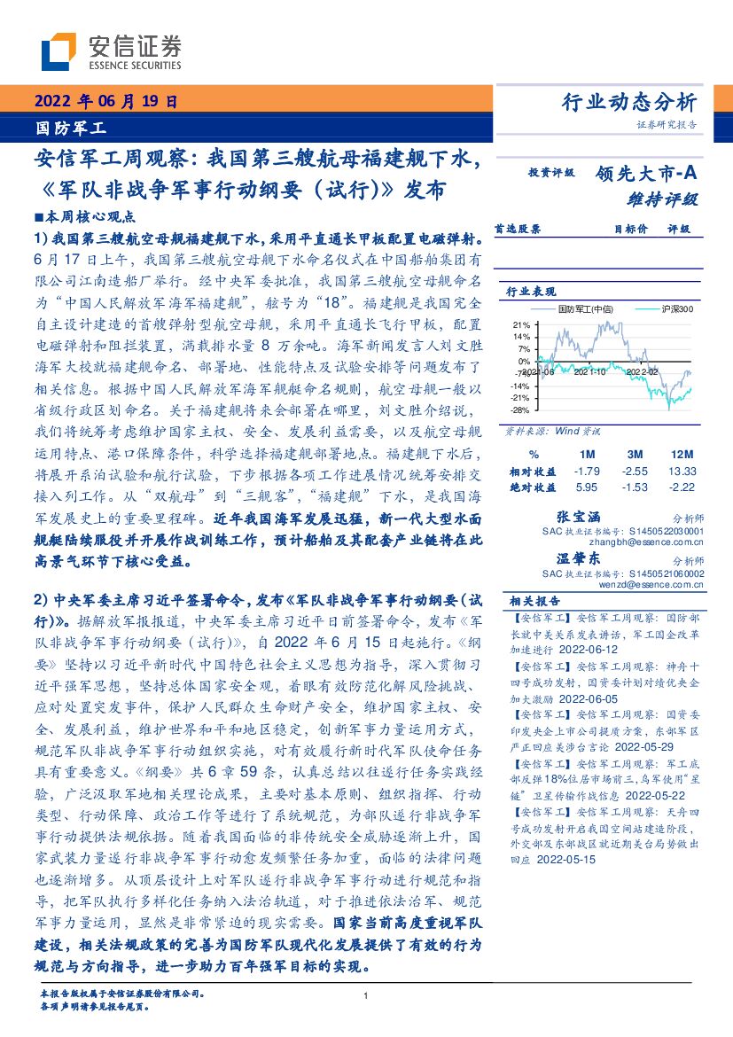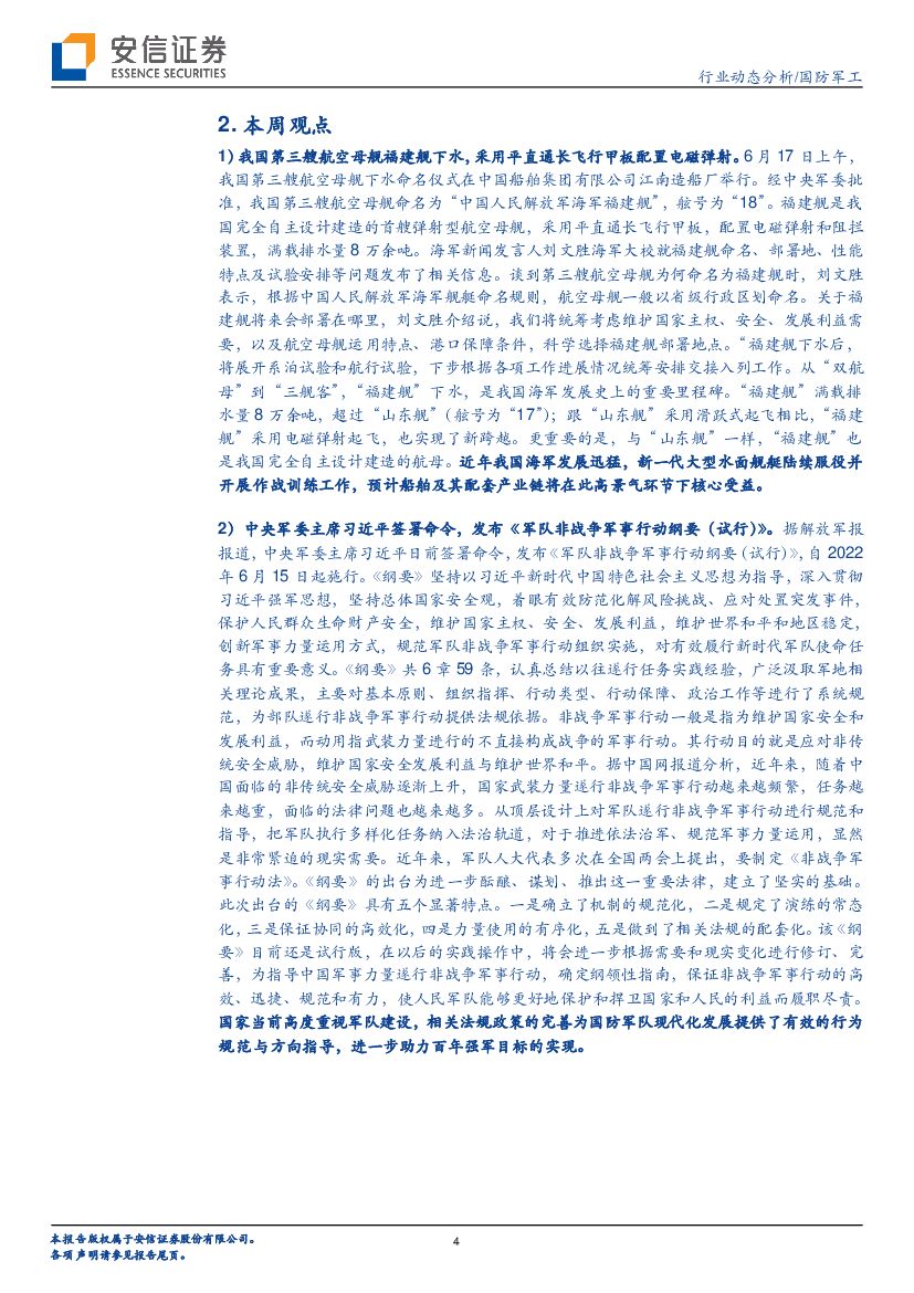安信证券:安信军工周观察:我国第三艘航母福建舰下水,《军队非战争军事行动纲要(试行)》发布.pdf