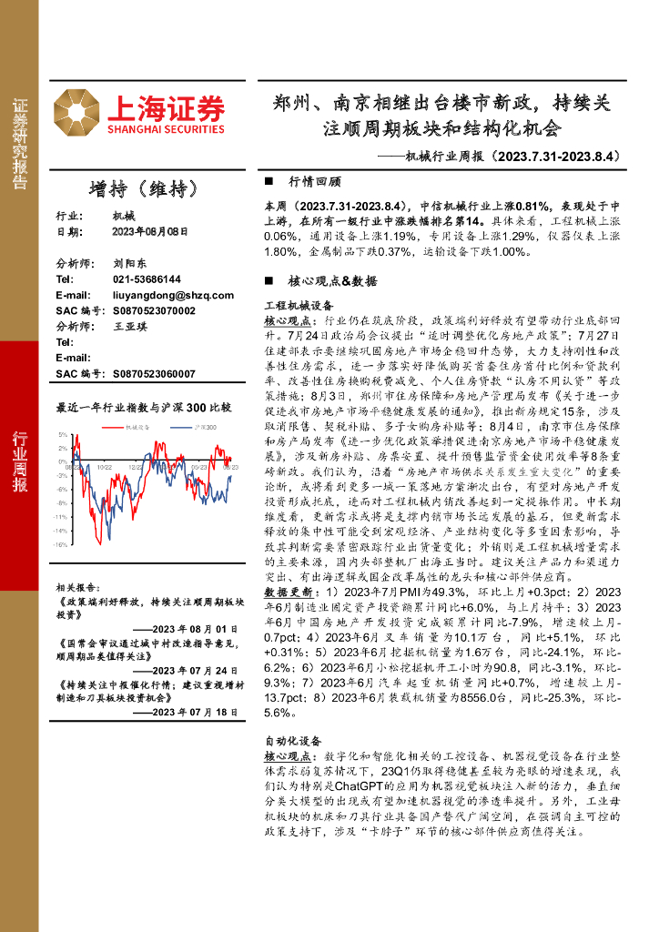 上海证券:机械行业周报:郑州、南京相继出台楼市新政,持续关注顺周期板块和结构化机会.pdf