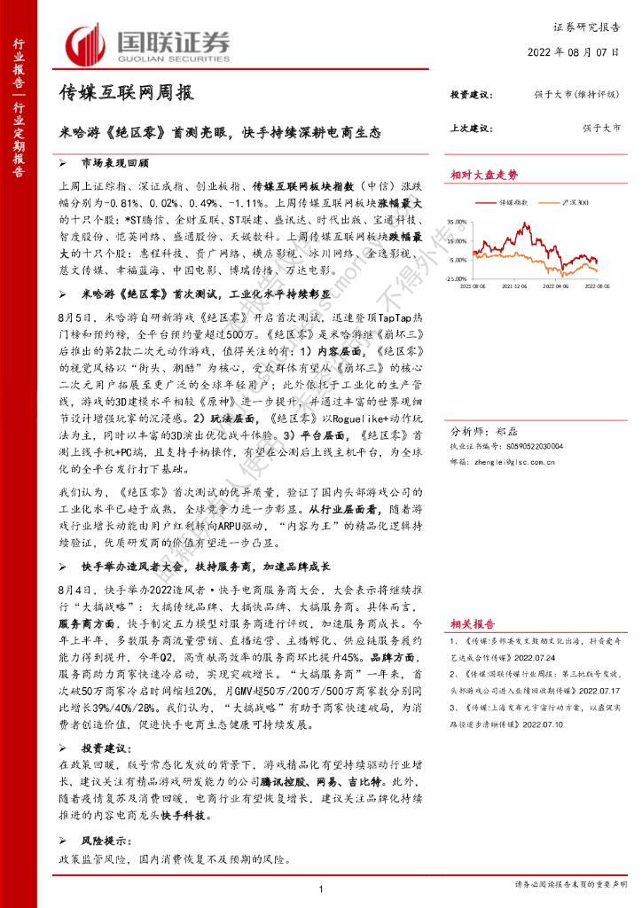 国联证券:传媒互联网周报:米哈游《绝区零》首测亮眼,快手持续深耕电商生态.pdf