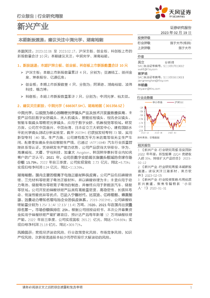 天风证券:新兴产业行业研究周报:本期新股速递:建议关注中润光学、湖南裕能.pdf